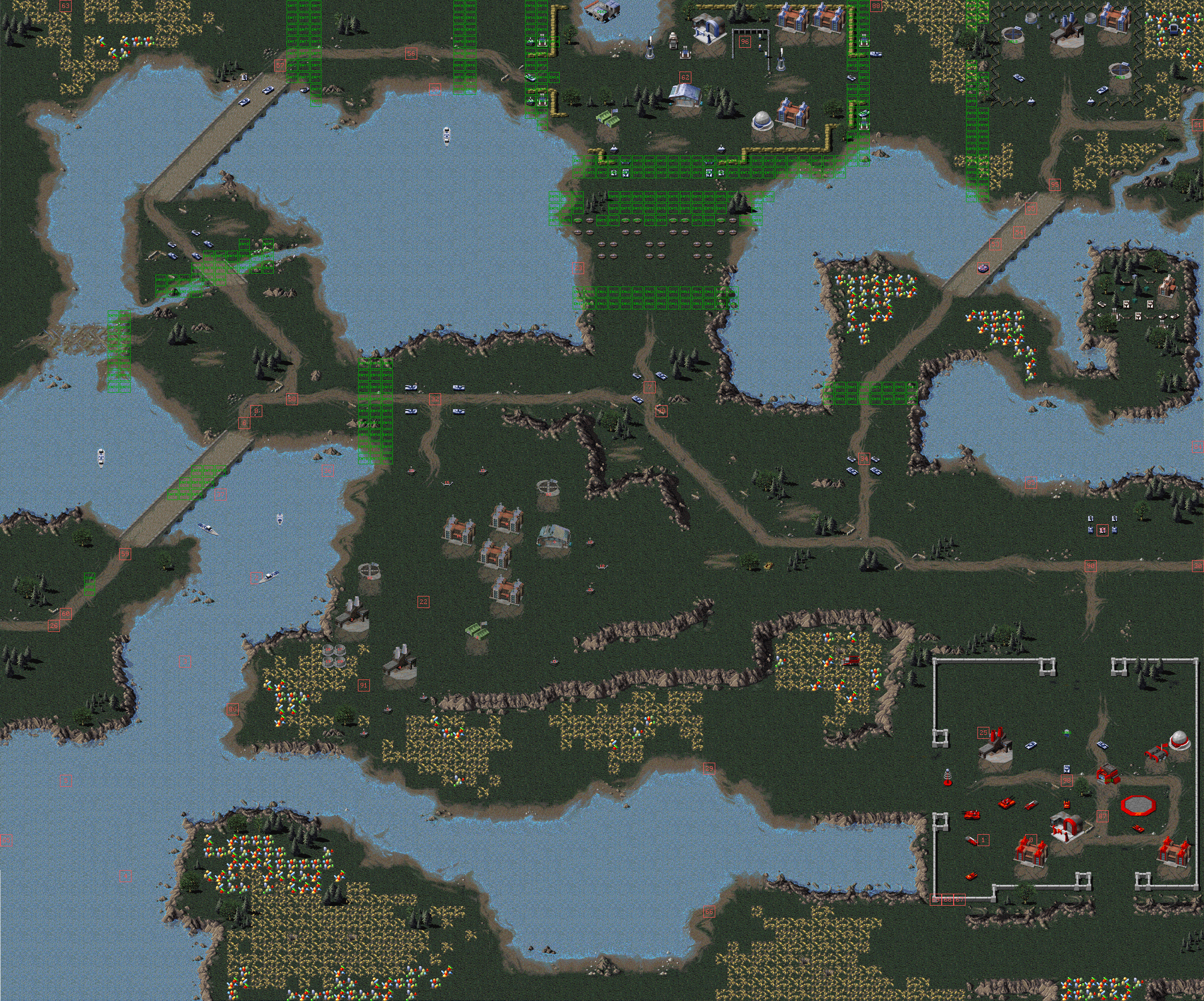 샘사이트를 건설하고 헤비 탱크를 계속 생산하라. 테슬라 코일은 적의 집중 공격목표가 될 뿐더러 비싸고 전기를 많이 소모하기 때문에 그다지 추천하지 않는다. 아군 기지의 남쪽과 남서쪽에는 자원이 풍부하나 정제소에서 너무 멀다. 사일로를 두 곳에 이어지어서 정제소를 건설하면 상당량의 자원을 얻을 수 있다. 남쪽 해안가에 헤비 탱크 5대 정도를 배치해두면 수송선 러시를 미리 막을 수 있다. 다른 곳도 마찬가지다.