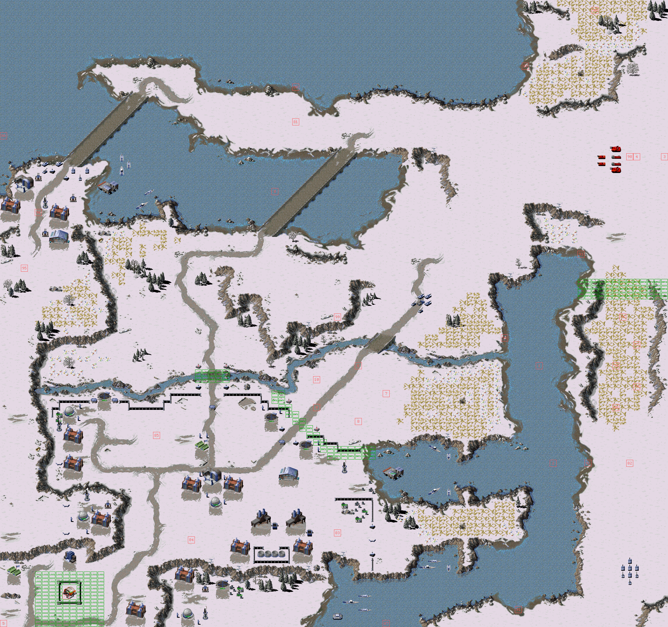 다만 A맵에서는 82번 지점에서 시작하는 것도 나쁘지 않았다. 적이 쳐들어 오는 루트가 몇 곳으로 좁혀지기 때문이다. MCV를 적진에 전개하는 삽질 없이 적을 얍삽하게 기지 안쪽부터 먹고 싶다면 우선 보통의 시작 지점에서 기지를 구축한다. 적의 소규모 기지부터 공략한다. 그러면 네 개의 레이더 돔 중 한 개를 엔지니어로 점령할 수 있는 시점이 온다.